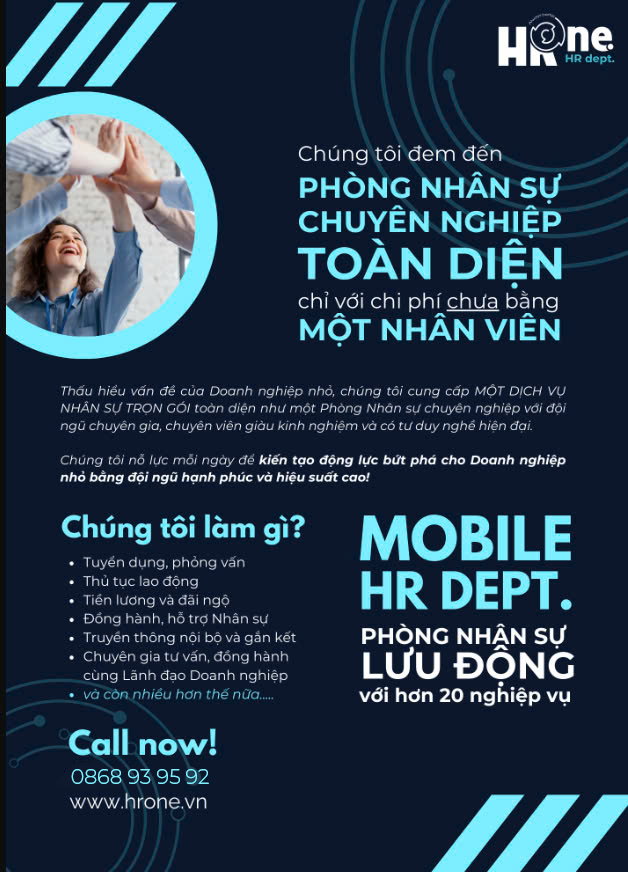 HROne – Phòng Nhân Sự Lưu Động, giải pháp ‘đo ni đóng giày’ cho doanh nghiệp nhỏ. Chúng tôi cung cấp đội ngũ chuyên gia nhân sự dày dặn kinh nghiệm (từ 10 năm trở lên!), am hiểu thị trường, sẵn sàng ‘xắn tay áo’ giải quyết mọi vấn đề của bạn, từ tuyển dụng đến quản lý hiệu suất.